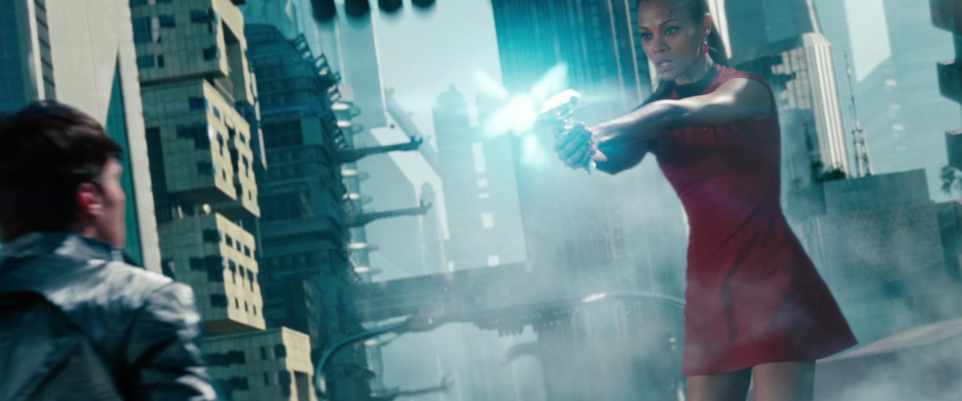 Let me stress that gendered uniforms of this kind are inherently sexist and misogynistic af, not to mention narrow-minded in their gender-role glory. Because they're telling you: You're a woman, so your role in life is to wear a uniform that's more uncomfortable, protects you less and limits your mobility, because you must look 'sexy' and attractive at all costs. They brainwash women into thinking this actually is logical and makes sense. And those women who don't get brainwashed effectively usually have to accept it anyway, or lose their job/not go to (a uniform) school/lose their acting job. It's one thing to like miniskirts/dresses, it's another thing entirely to have to wear them as a uniform in the wrong context just because of your gender and because a male designer/male somebody in power said so (Michael Kaplan again: "We loved the idea of sticking to the homage of the 1960s and putting the girls into mini-skirts [he forgot about the 'lots of different options here!]. Zoë Saldana is adorable - it was so much fun to dress her. She has such a great figure for short skirts and the costume - she was the main prototype for the costumes").