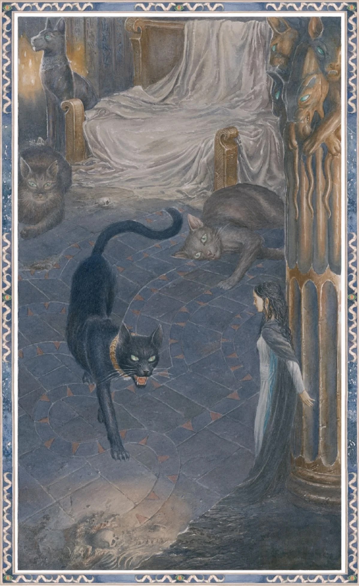 | Fig. 3: Watercolour plate - Lúthien, discovered in spite of her shadowy cloak, cowers from Tevildo, Prince of Cats, the predecessor of Sauron. |